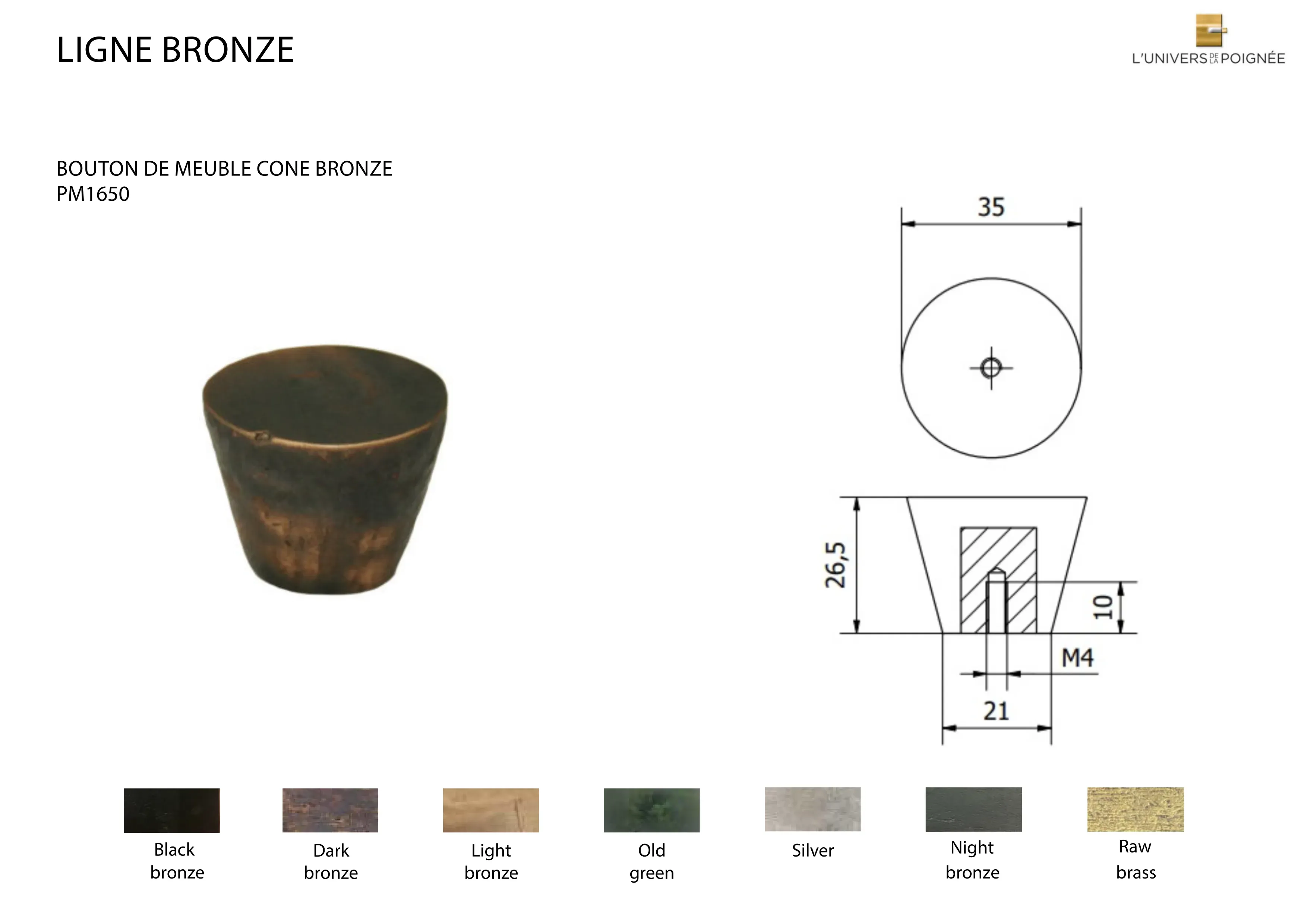 Parce que le bronze est un matériau vivant, ce modèle est proposé avec des patines spécialement développées, qui lui permettent d’acquérir une patine naturelle au fil du temps et de s’embellir avec l’usage. Elle peut également être déclinée avec les finitions du laiton, bien que des variations de teintes puissent apparaître par rapport aux collections en laiton classique.