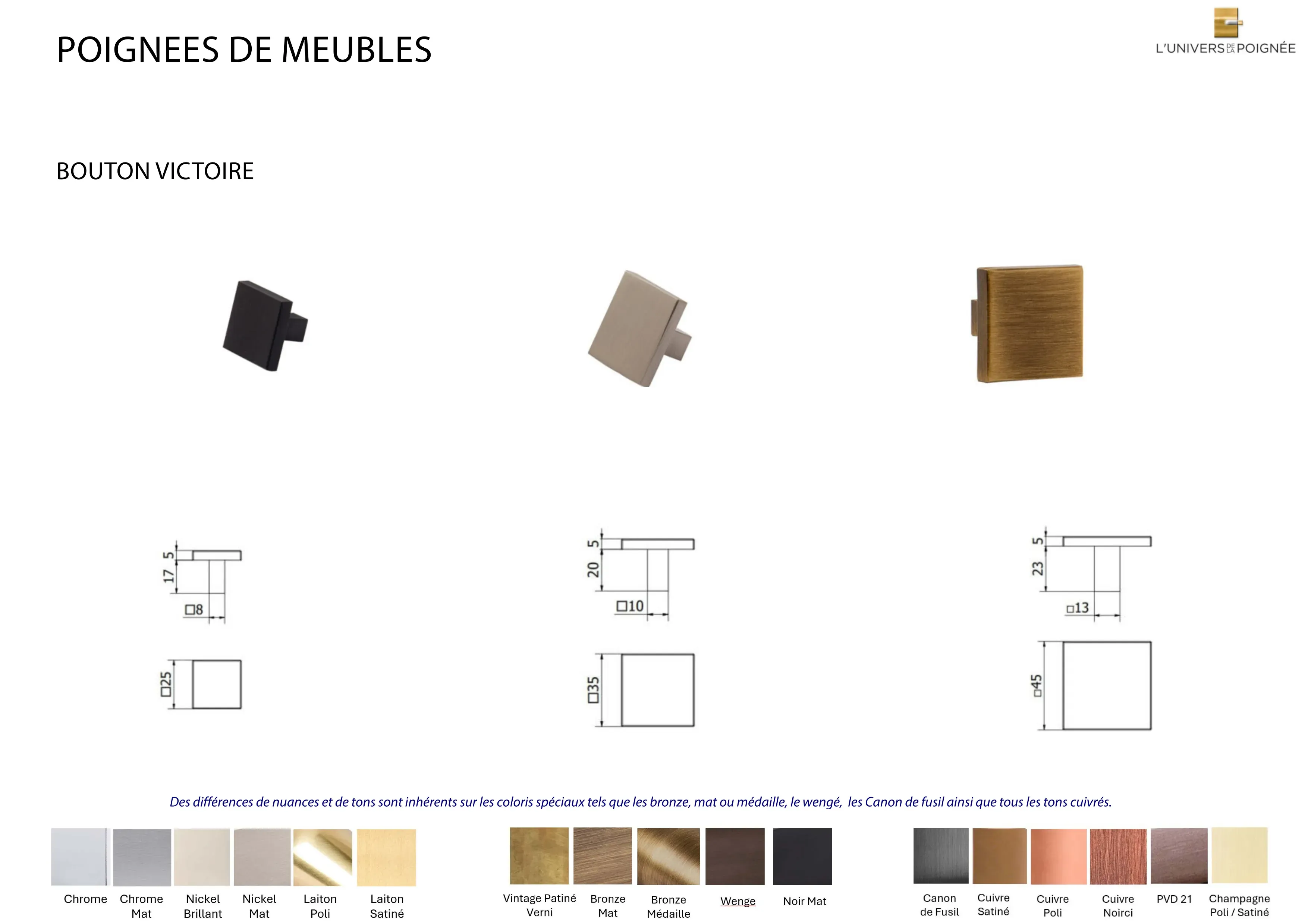 Parce que chaque intérieur mérite une finition sur mesure, le bouton de meuble Victoire est disponible en plus de 15 coloris différents, parmi lesquels : Laiton satiné ; Laiton poli ; Chrome mat ; Chrome brillant ; Nickel mat ; Nickel brillant ; Bronze mat ; Bronze médaille ; Bronze vintage ; Wengé ; Blanc ; Noir mat ; Canon de fusil ; Cuivre satiné ; Cuivre brillant ; Cuivre noirci ; Champagne mat ; Champagne brillant