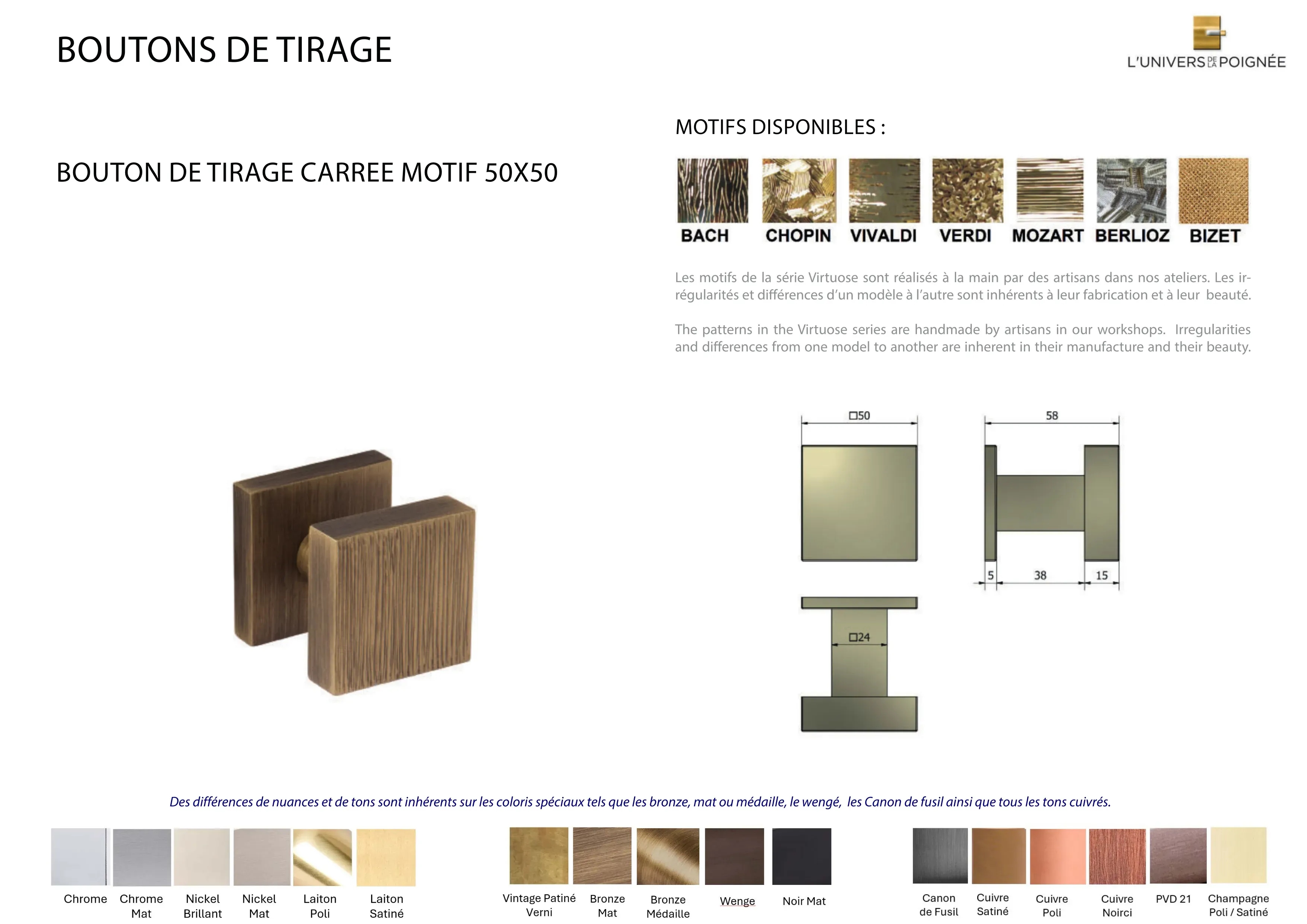 Bouton de tirage carré VIRTUOSE 50x50mm