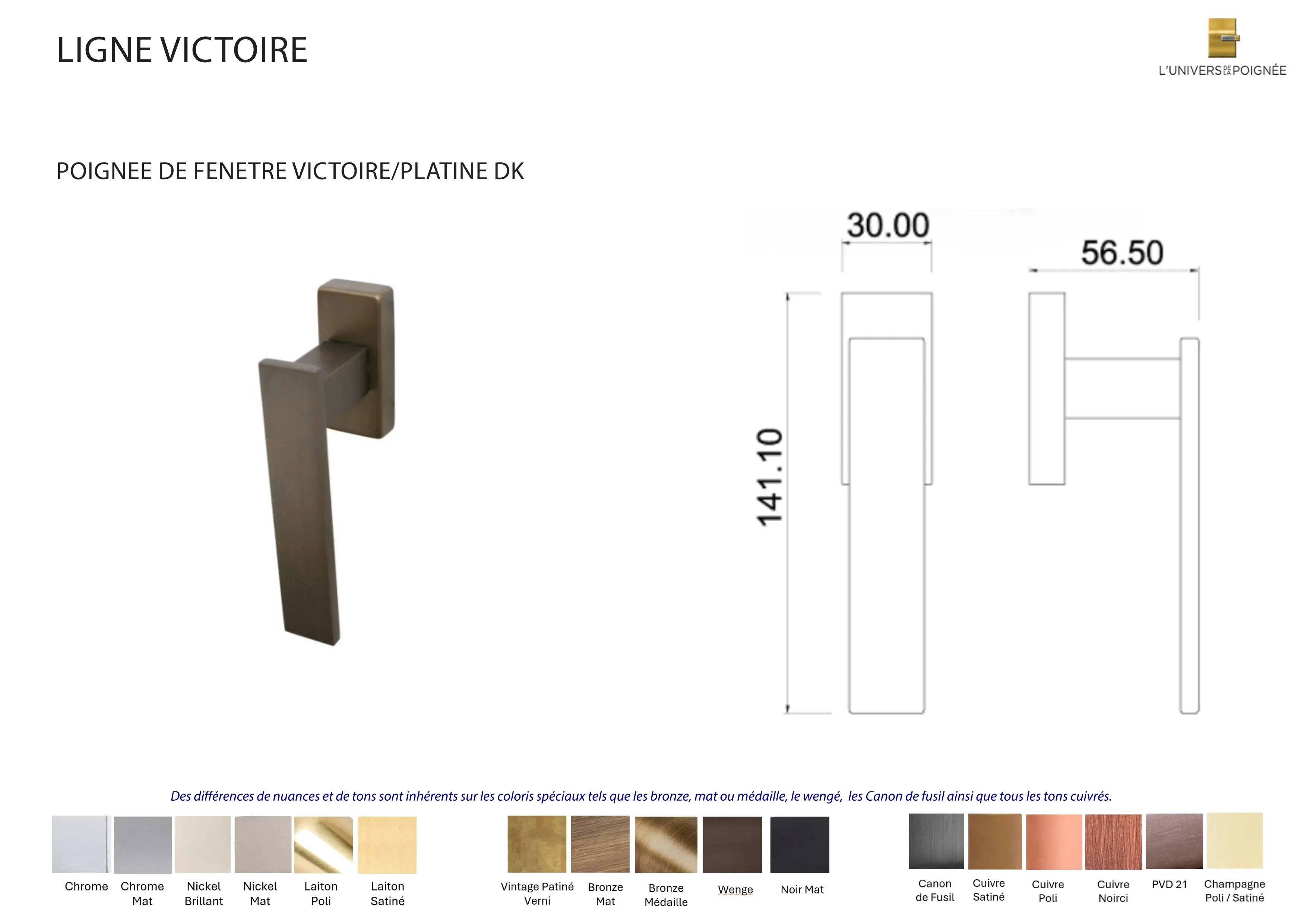 Des différences de nuances et de tons sont inhérents sur les coloris spéciaux tels que les bronze, mat ou médaille, le Wengé, les Canon de fusil ainsi que tous les tons cuivrés.