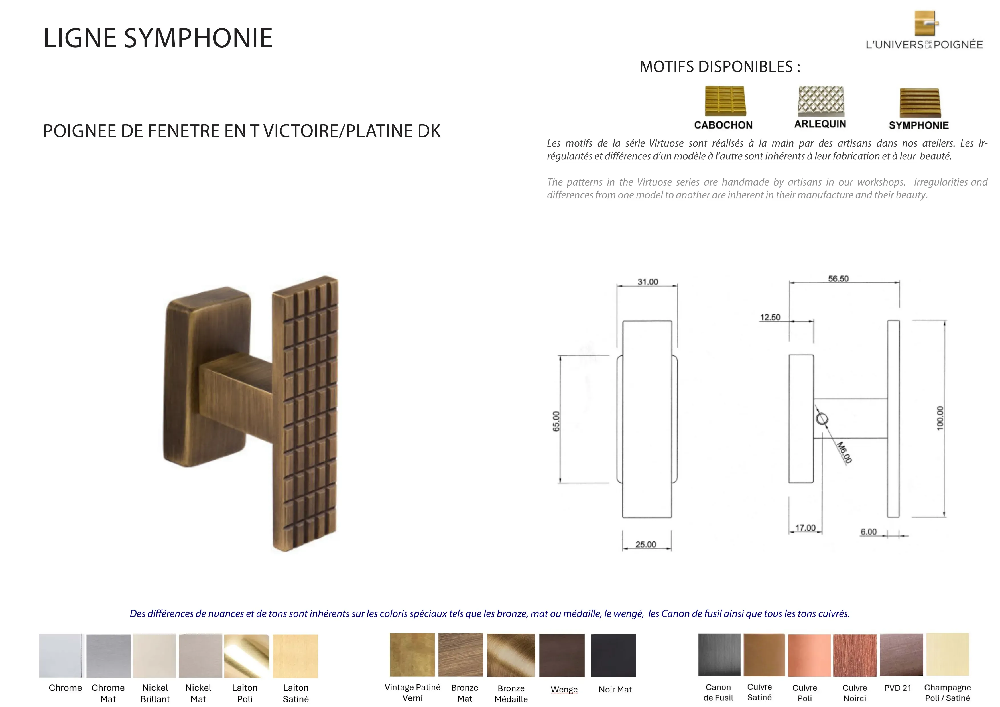Parce que chaque intérieur mérite une finition sur mesure, la poignée de fenêtre Victoire est disponible en plus de 15 coloris différents, parmi lesquels : Laiton satiné ; Laiton poli ; Chrome mat ; Chrome brillant ; Nickel mat ; Nickel brillant ; Bronze mat ; Bronze médaille ; Bronze vintage ; Wengé ; Blanc ; Noir mat ; Canon de fusil ; Cuivre satiné ; Cuivre brillant ; Cuivre noirci ; Champagne mat ; Champagne brillant