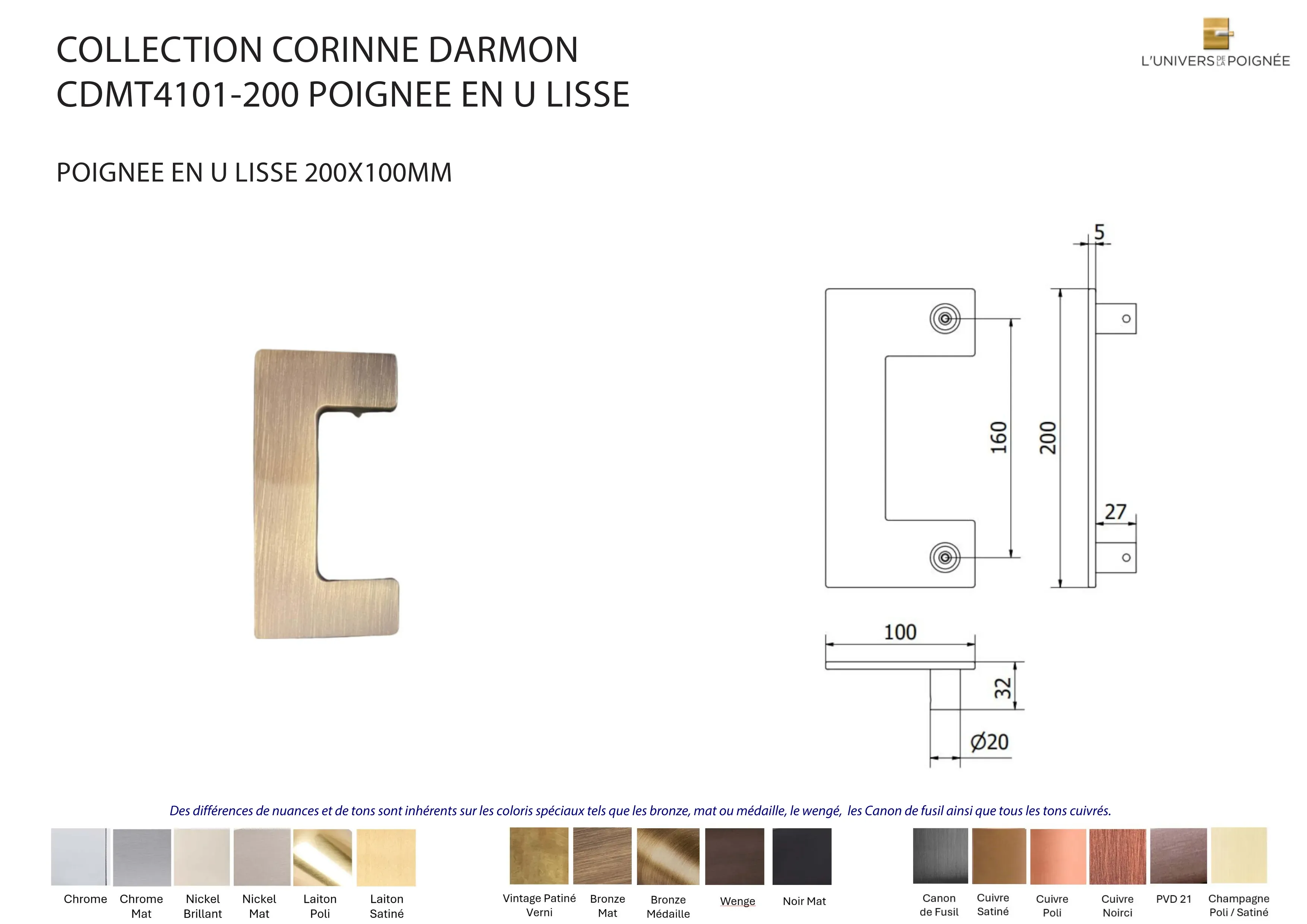 Laiton satiné ; Laiton poli ; Chrome mat ; Chrome brillant ; Nickel mat ; Nickel brillant ; Bronze mat ; Bronze médaille ; Bronze vintage ; Wengé ; Blanc ; Noir mat ; Canon de fusil ; Cuivre satiné ; Cuivre brillant ; Cuivre noirci ; Champagne mat ; Champagne brillant